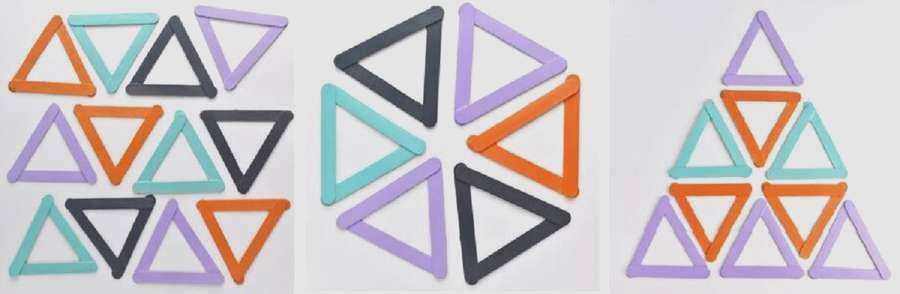 Головоломка из палочек от мороженого. Нужно много палочек, склеить из них треугольники и выкрасить в разные цвета. Из получившихся треугольников можно выкладывать разные фигуры, не обязательно геометрические, например, собаку или цветок.