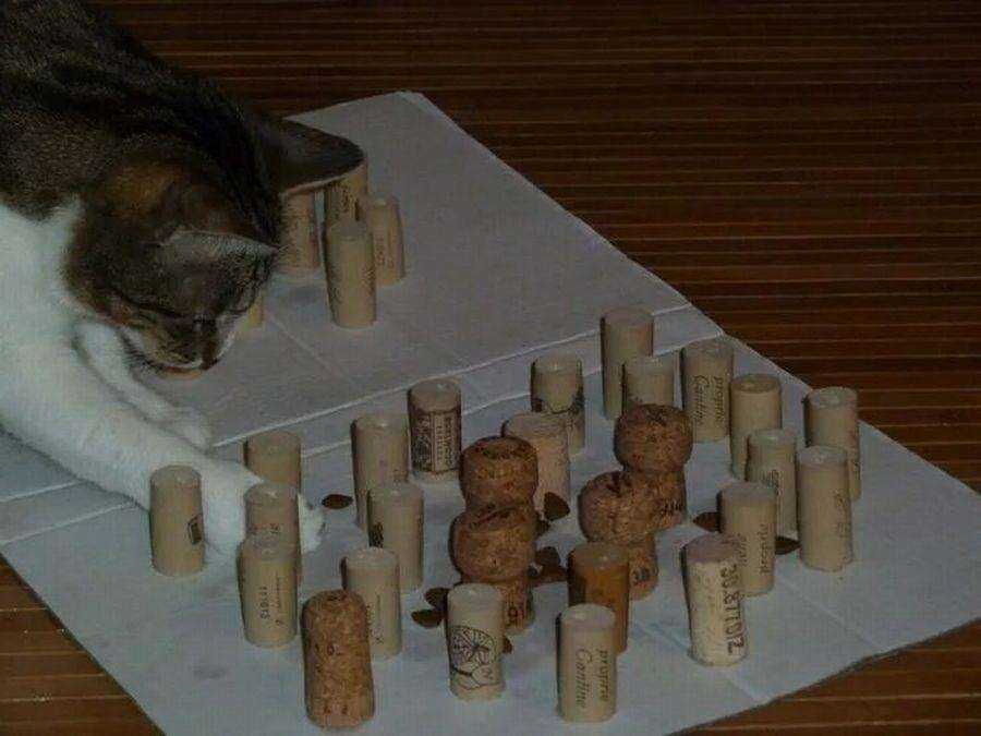 А этот квест надо пройти как можно быстрее — вдруг корм исчезнет, поэтому лапками, лапками между пробками — быстро-быстро как только можно. Картона лист и много пробок от вина — вот и готов увлекательный квест для кошки.