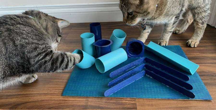 Много втулок из картона, которые превращаются в увлекательную игру по поиску вкусняшек для кошек.