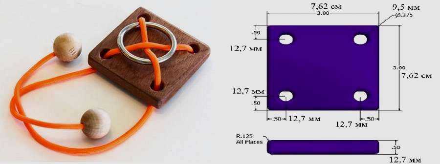 Простая головоломка «Властелин колец» и ее чертеж с размерами. Для производства нужны торцовочная пила и сверлильный станок, шлифмашинка и сверла 3,2 и 9,5. Из материалов понадобится доска 7,62Х12,7, кольцо диаметром 3,81, паракорд или парашютная стропа. Кольцо может быть металлическим или пластмассовым, допустимо и дерево.