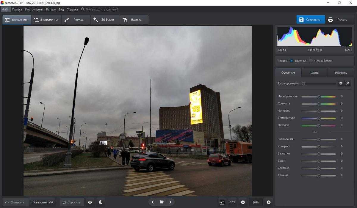 Фоторедактор ФотоМАСТЕР от российского разработчика программного обеспечения AMS Software существует только в платном варианте, с другой стороны за небольшую сумму (около 700 рублей) пользователь получает удобный и проработанный инструмент обработки фотографий. С сайта разработчика можно скачать бесплатную пробную версию и оценить все возможности. В отличие от других программ, ФотоМАСТЕР действительно позволяет максимально автоматизировать «улучшение» фото, его интерфейс простой и понятный — все операции делаются в несколько кликов, разбираться с панелями инструментов не нужно. На сайте разработчика есть десятки подробных видеоуроков и статей, которые позволят быстро разобраться с функциями программы и начать творчество. Именно с ФотоМАСТЕР обработка тестовых кадров заняла меньше всего времени.