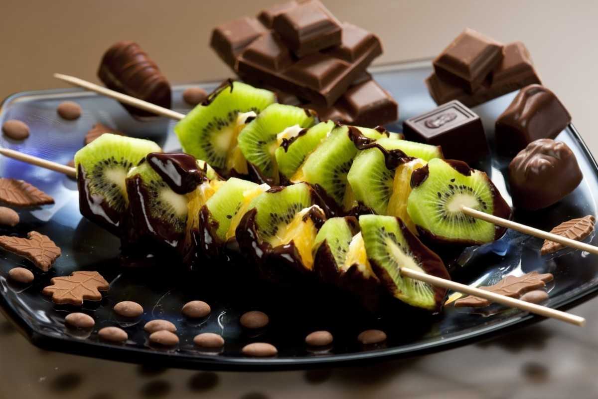 Очень красиво и оригинально будут смотреться фрукты в шоколаде. Сделать их просто. Нужно взять плитку шоколада, растопить и обмакнуть в нем любимые фрукты. Поставить в холодильник, а потом собрать красивый натюрморт или букет.