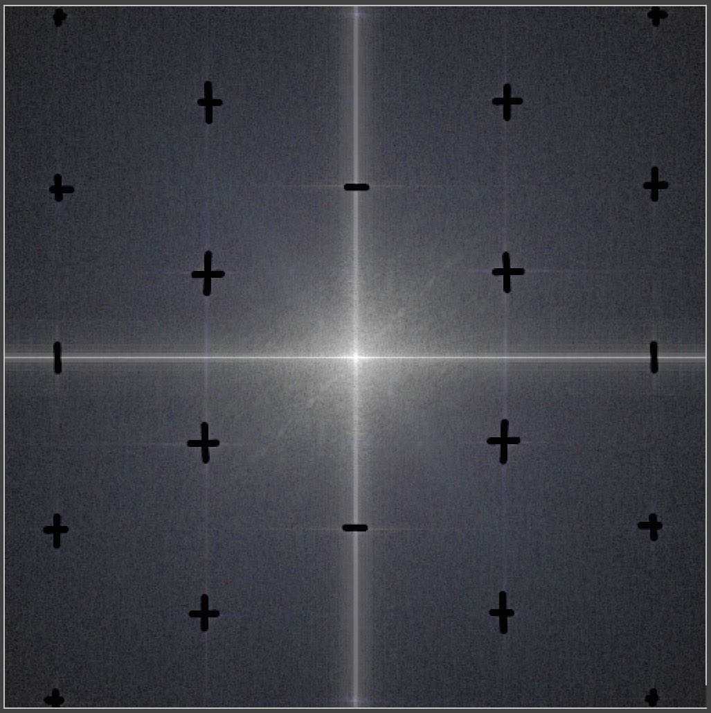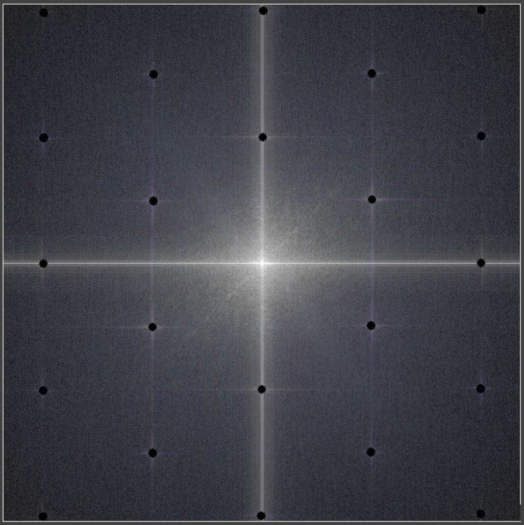 This is a second test of the same photo, but the solid white areas were deselected before using the fft filter. After using the fft filter, white areas no longer developed a faint pattern. Also, using crosses still worked vastly better than using dots.  |