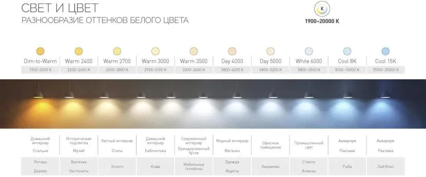 Условно мы имеем следующую таблицу цветовой температуры светодиодных ламп:
