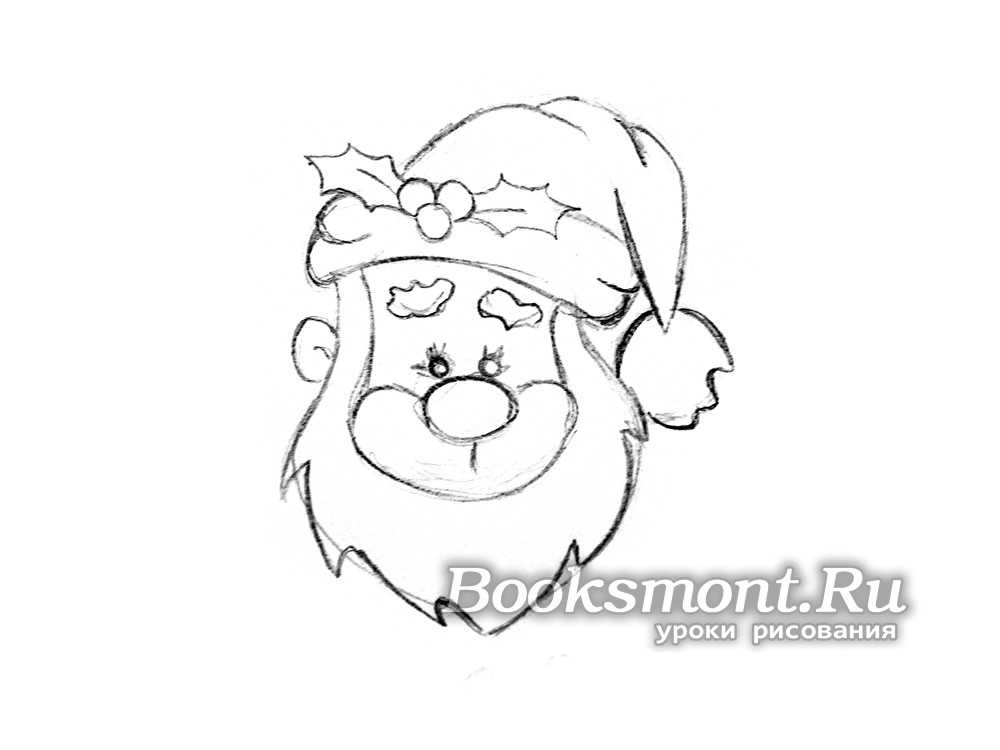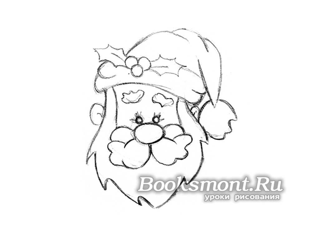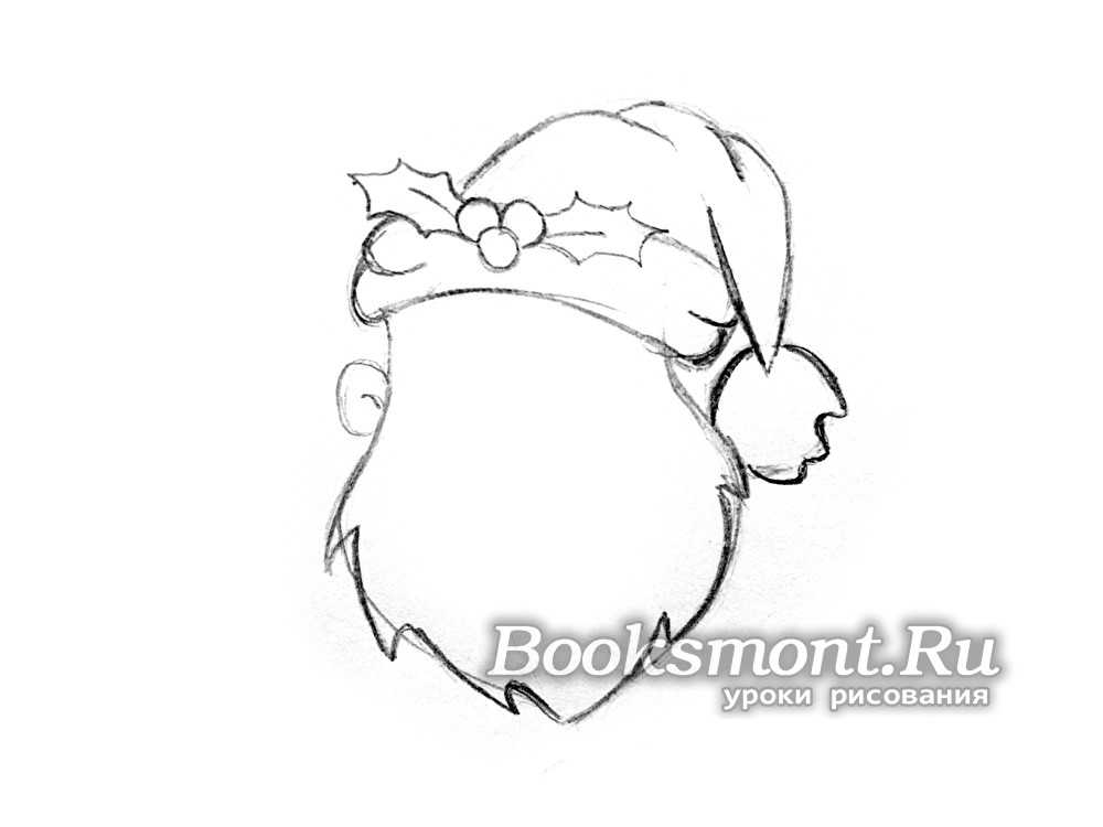 Затем корректируем форму и контур шапки, чтобы придать ему более выразительные черты. Украсим ее листиками и ягодами рождественского растения. Также немного уделим время прорисовке контура бороды, ведь ее нужно делать более естественной. Также ластиком убираем линии и переходим к следующему этапу.
