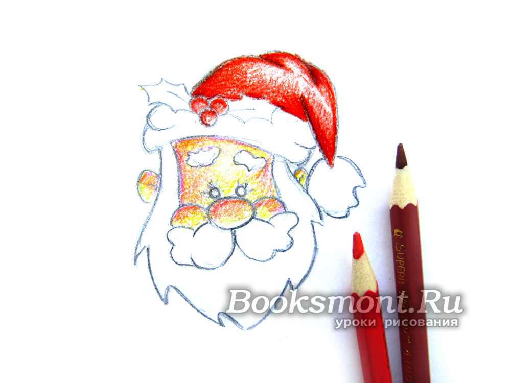 Красивую новогоднюю шапку на голове дедушки закрашиваем ярко-красным карандашом. Прорабатываем затем тень и полутень бордовым карандашом. На рисунке также имеются ягодки рождественского растения, которые также следует сделать красно-бордового цвета.