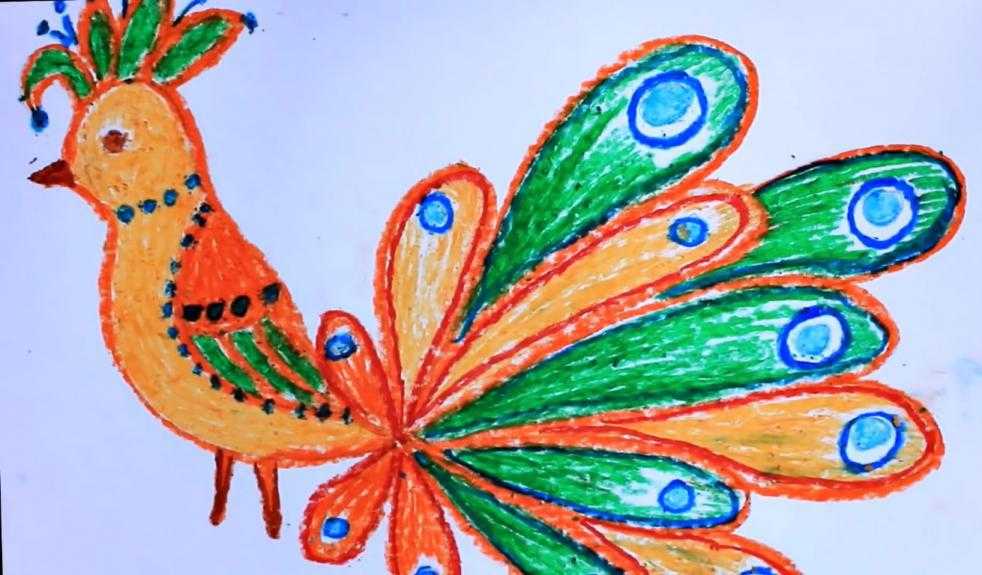 Ваш рисунок будет смотреться более выразительно, если вы воспользуетесь восковыми мелками, особенно для обводки контура и раскраски перьев.Во время наброска эскиза проговаривайте с ребенком название фрагментов создания рисунка.