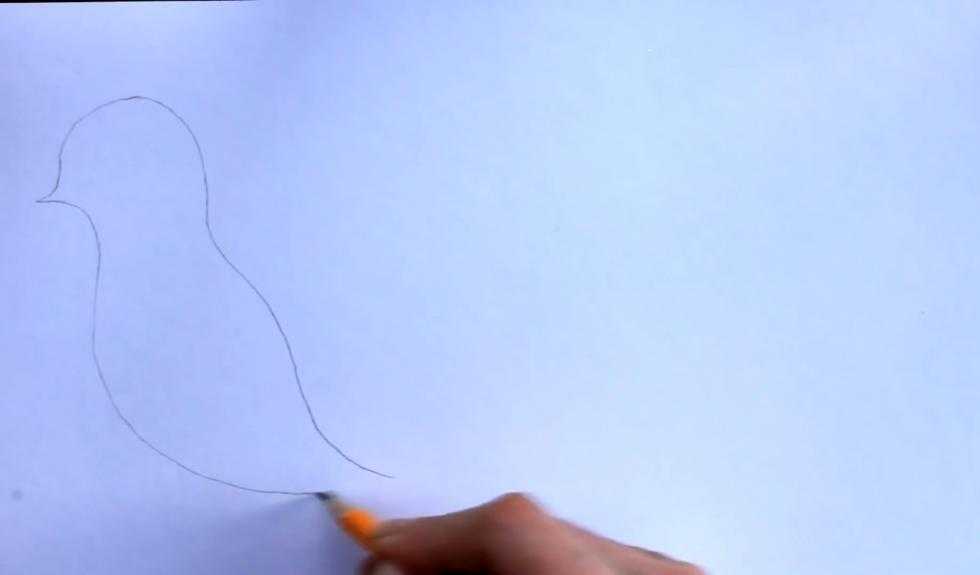 Начинаем рисование с головы. Изображаем овал, отмечая клювик, рисуем ниже: шейку, брюшко, спинку, соединяя линии в конце.
