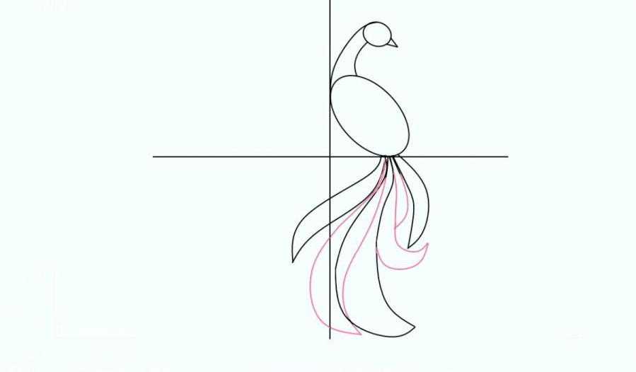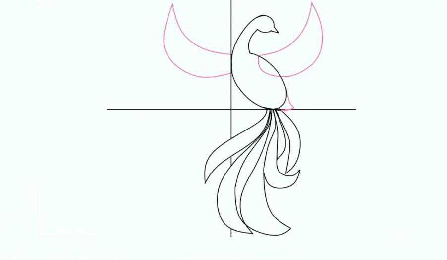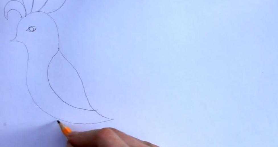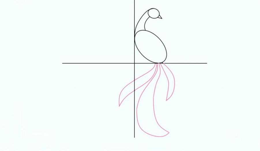 Главные перья рисуют длинными и изогнутыми, после них — хвост из таких же перьев. Делается при изображении линий одинаковый наклон, за исключением тех перьев, которые находятся ближе всего к телу птицы.