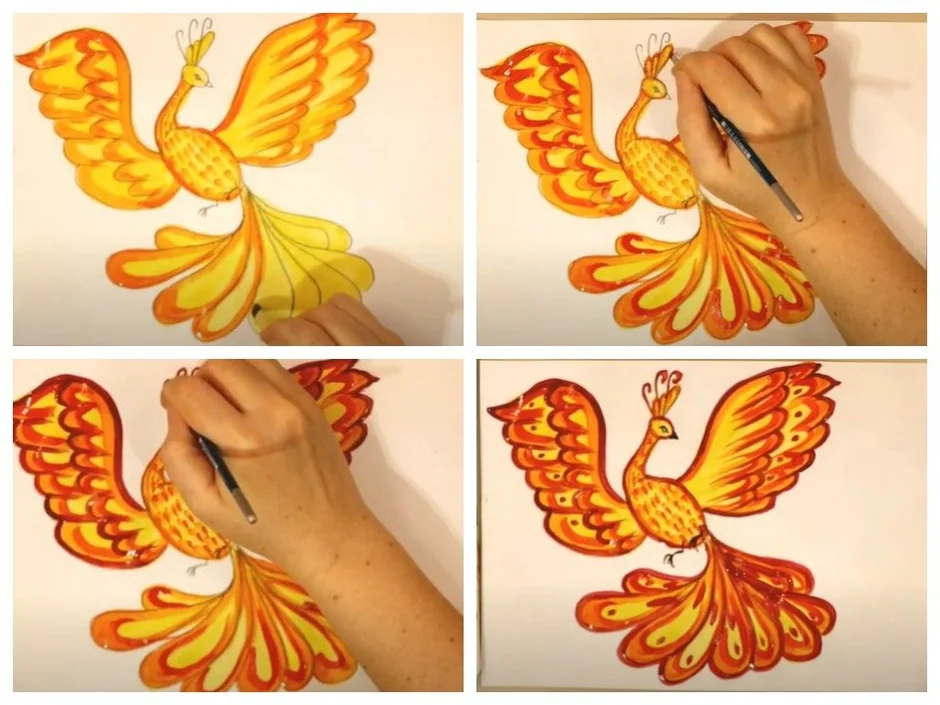 Для нарисования жар-птицы поэтапно, можно использовать следующие техники: