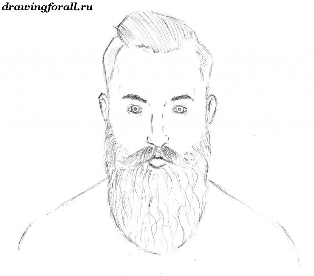 После этого прорисуем ушные раковины, окантуем контур носа и начнём прорисовывать бороду. В районе усов наложите плотный слой волнистых линий, рисуя их от корней волос к кончикам. Также и с бородой — нарисуйте внутри неё волнистые линии, двигаясь по направлению сверху вниз.