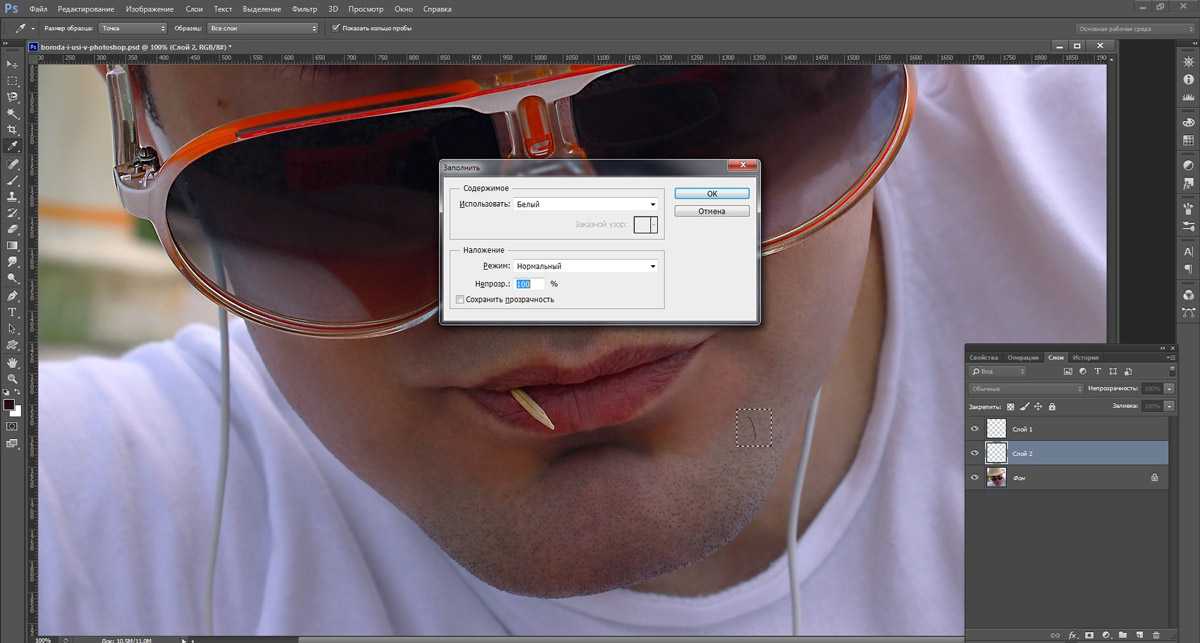 Когда, методом проб и ошибок, у вас получится более-менее приемлемый результат, приступайте к «Определению кисти». Для этого создайте новый слой под слоем с волосом, и создайте выделение с помощью инструмента выделения ( – M). Залейте выделение белым: нажмите правой кнопкой на выделении – Выполнить заливку – Использовать: Белый – ОК.