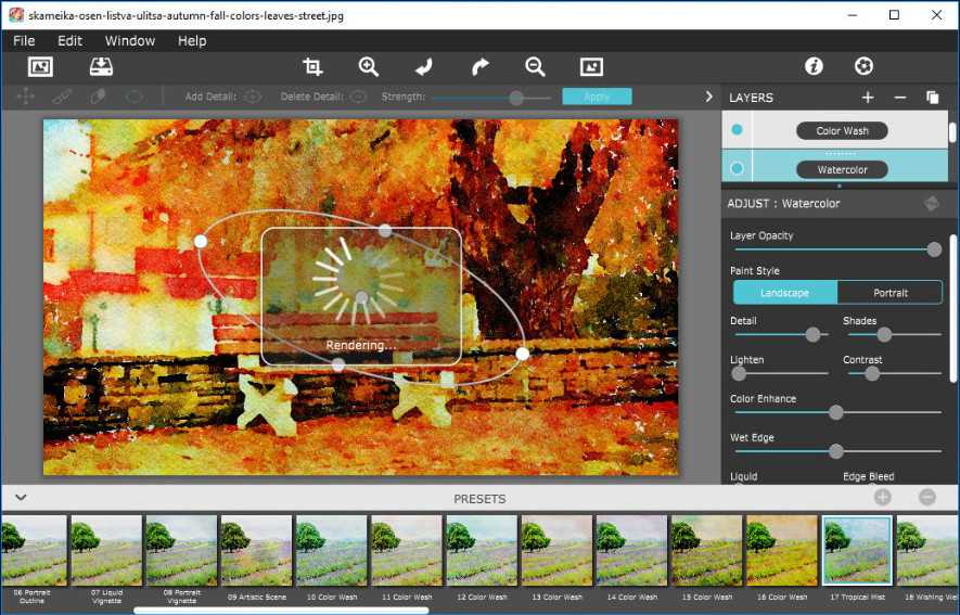 Создаваемые ею эффекты качественно отличаются от того, что предлагают другие подобные инструменты. Обработанные в программе изображения выглядят максимально естественно и натурально, и всё это благодаря продуманной системе рендеринга, отражающей самую суть акварели как техники живописи. В зависимости от изображенного на фотографии, имитируемые краски выглядят то мягкими и воздушными, то плотными и насыщенными, как это свойственно акварели, и даже подтеки программа оставляет на изображении будто на настоящем холсте.