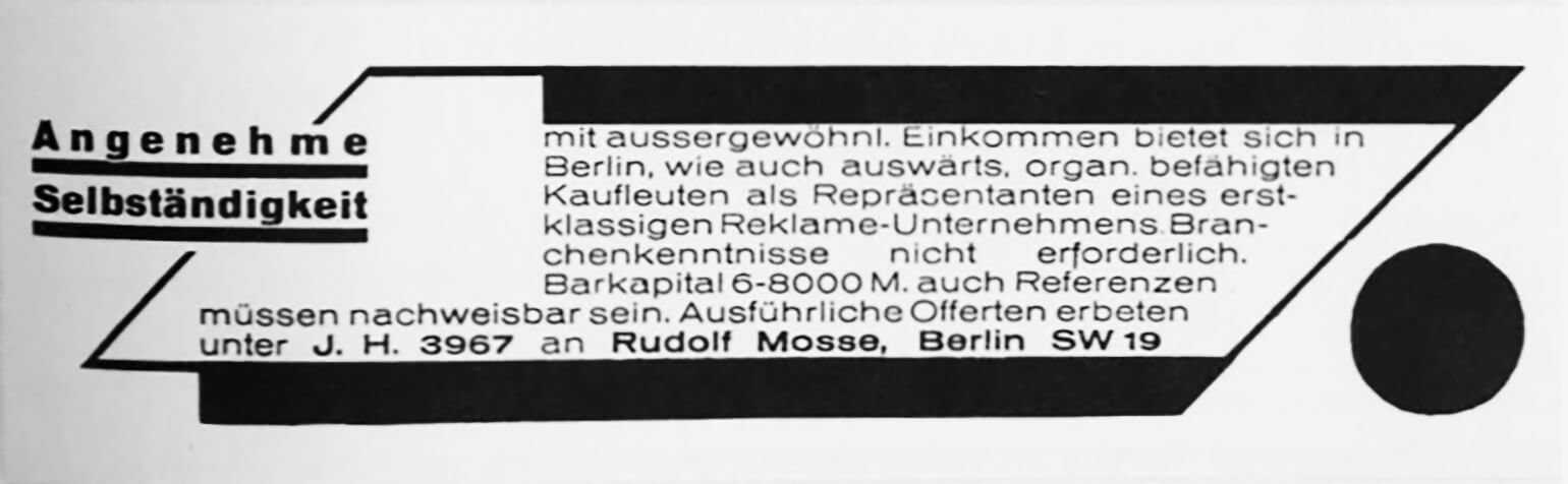 Рекламное объявление, немецкая газетаИзображение: Die Neye Typographie / издательство «Бринкман унд Бозе», 1987 год