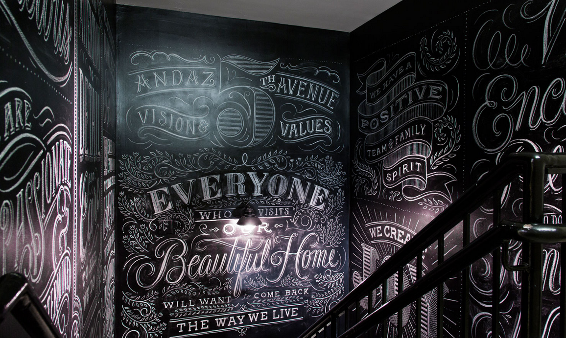 На грифельной поверхности можно просто рисовать, импровизируя, записывать свои мысли и рецепты или оставлять послания домочадцам. Однако такое творчество может выглядеть небрежно и не служить на пользу интерьера. Часто эталоном оформления грифельной стены становятся кафе — стены в современных заведениях расписаны красивыми шрифтами в разных сочетаниях и дополнены рисунками.