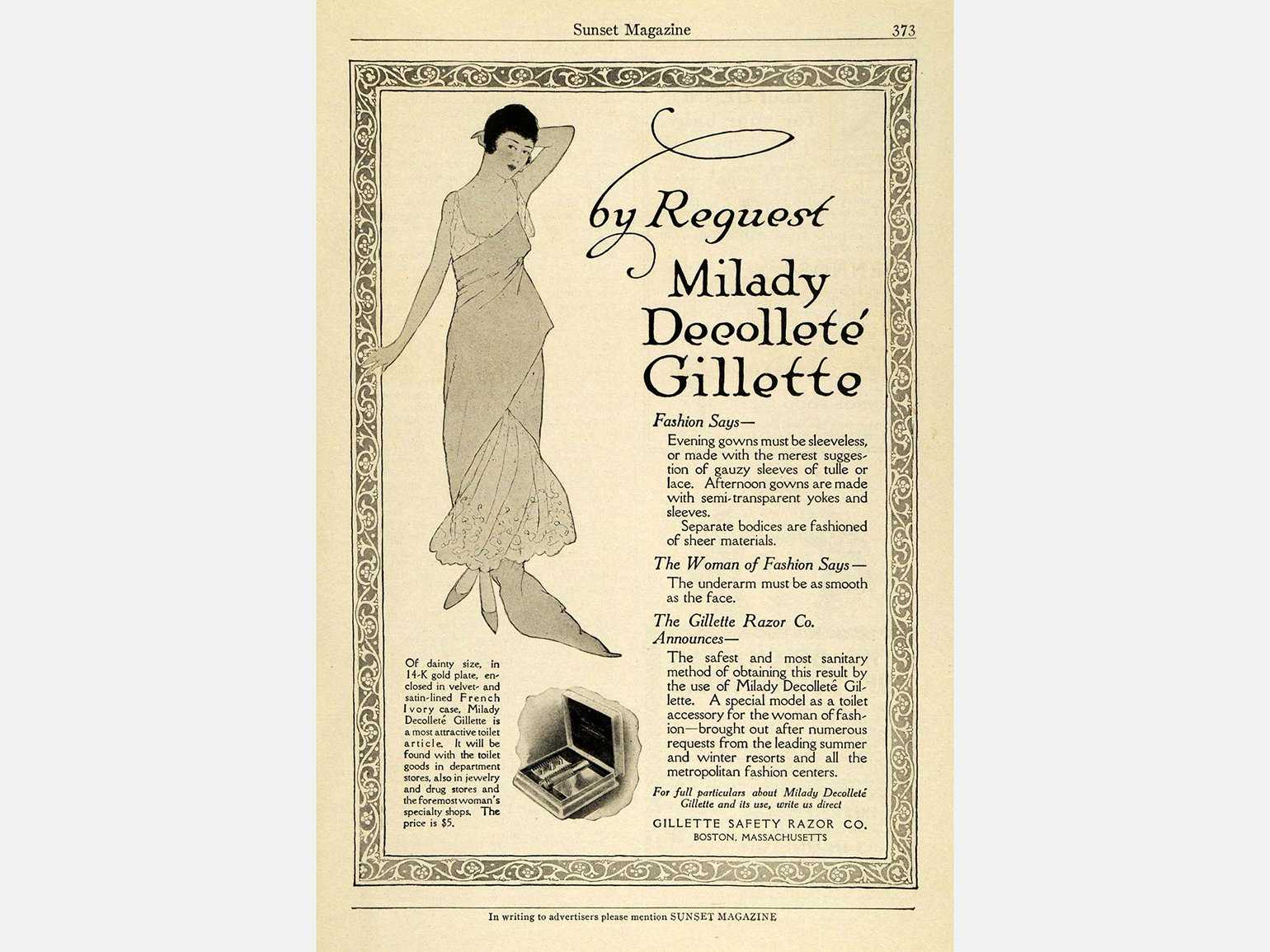 В 1915 году в Harper’s Bazaar появилась реклама: на фото модель стояла с высоко поднятыми руками, а волосы в подмышках отсутствовали. В том же году Gillette выпустили женскую безопасную бритву под названием Milady Décolleté.