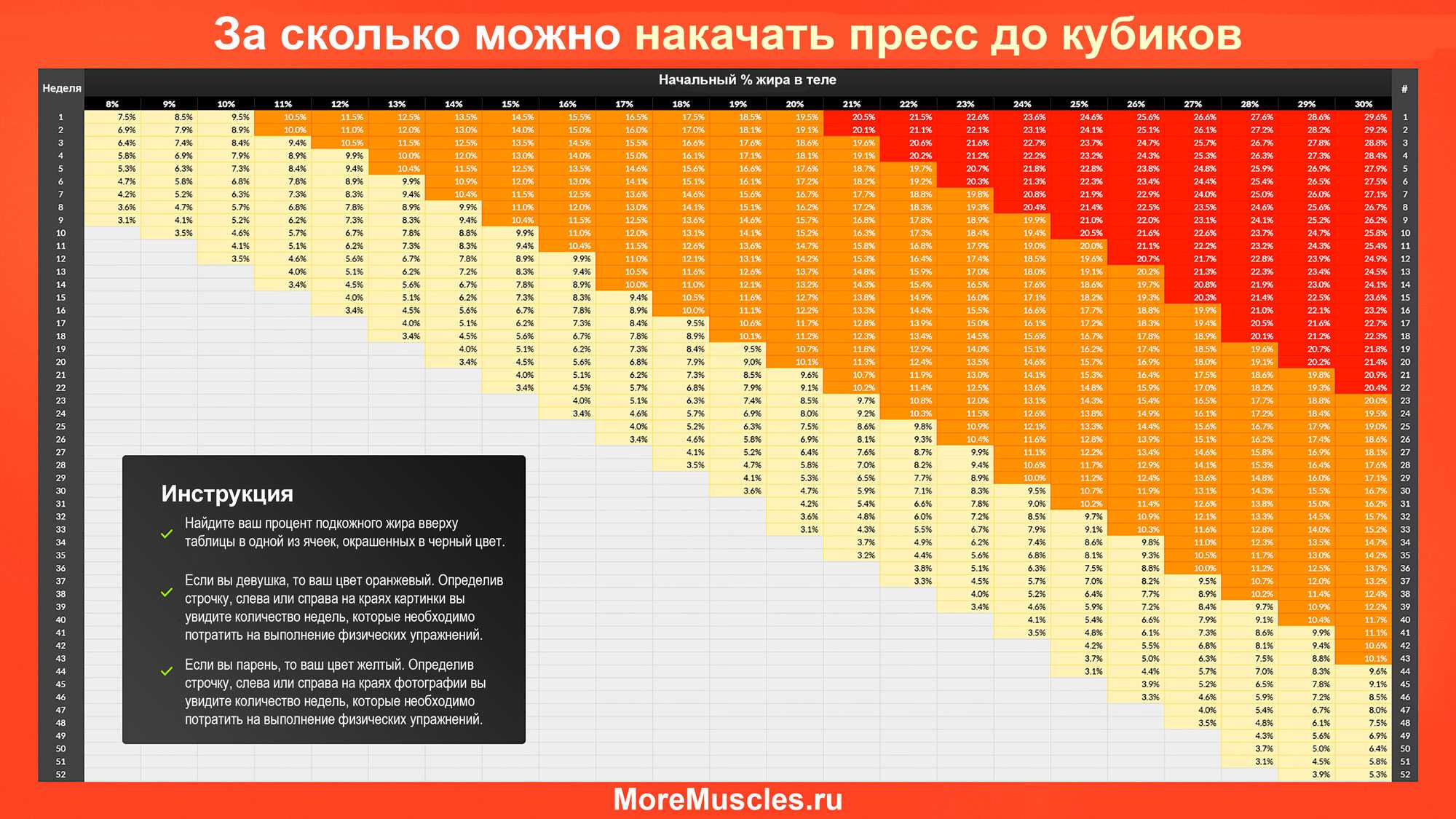 Эта таблица демонстрирует сколько в среднем процентов жира вы будите терять от недели к неделе. Она дает вам примерную оценку времени, через какой срок вы сможете выкладывать свои красивые фотографии в Instagram.