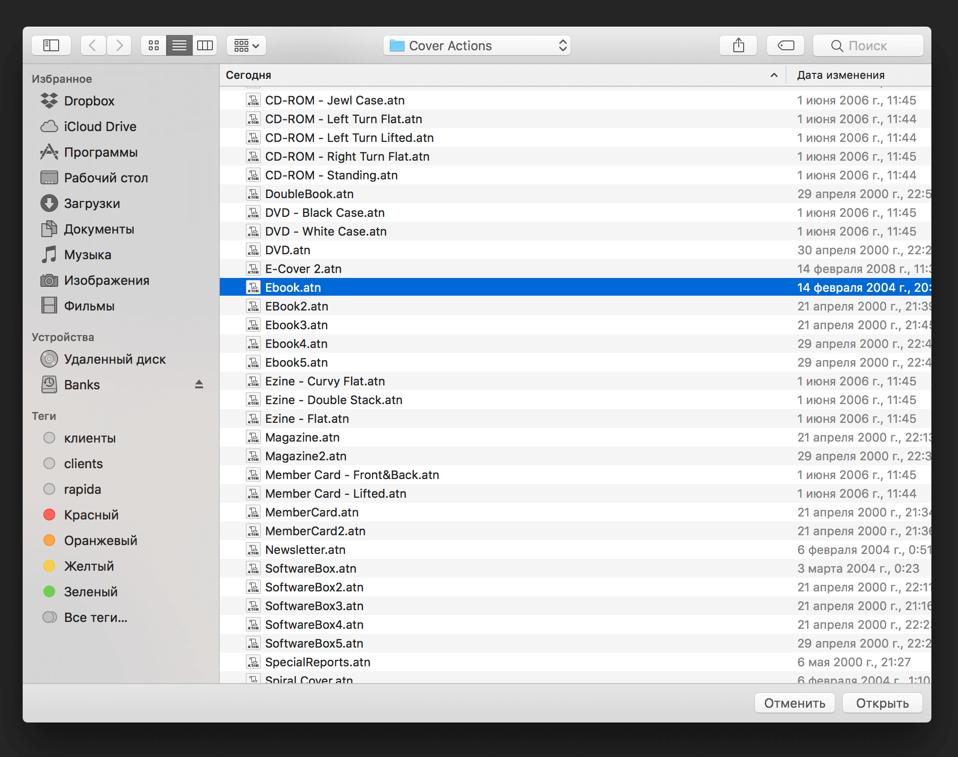 В этом окне находим папку подготовленными экшенами, кликаем по нужному и нажимаем “Открыть (Load)”.