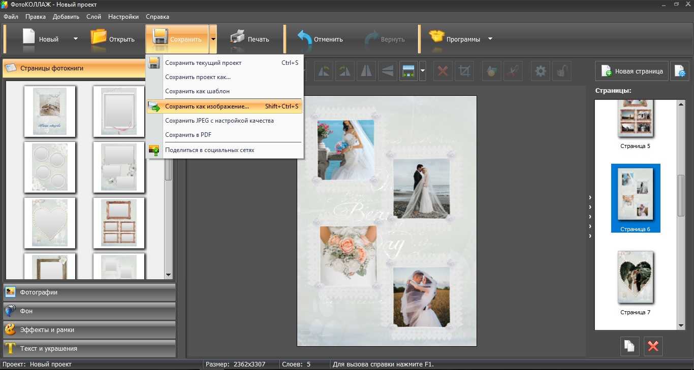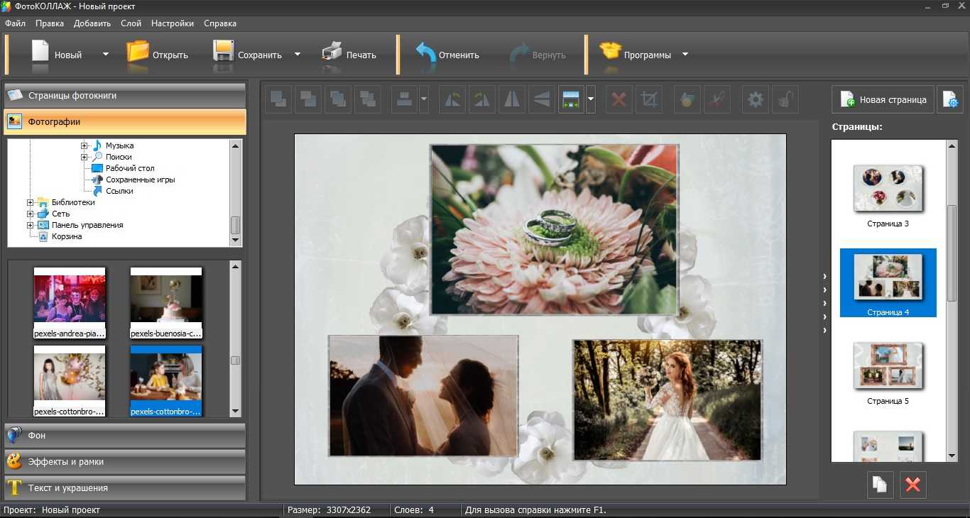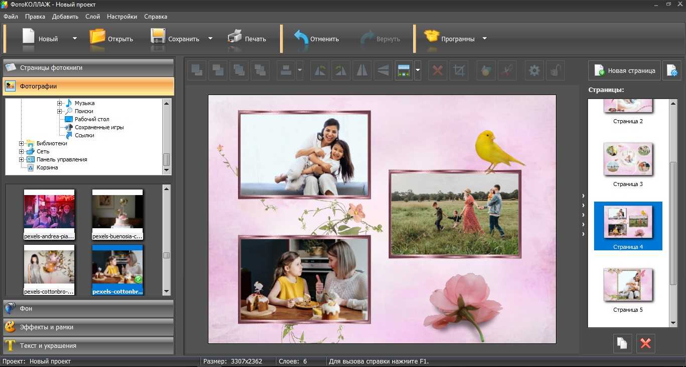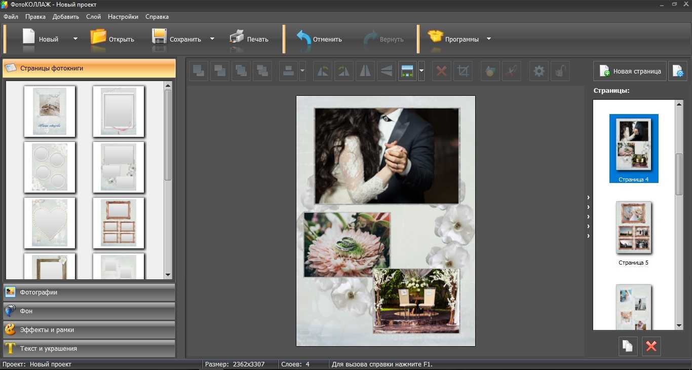 Программа загрузит редактор, где можно добавлять и удалять элементы, встроить графику, изменить расположение фото в фотокниге и фоновую подложку. Также вы можете свободно добавлять неограниченное количество страниц.