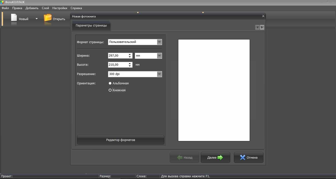 Запустите программу и в стартовом окне выберите пункт «Новая фотокнига». Укажите формат, выбрав из предустановленных пресетов, или введите размеры вручную. В поле «Разрешение» укажите 300 DPI – это стандарт в большинстве печатных издательств. Выберите ориентацию: альбомная (горизонтальный лист) или книжная (вертикальный).