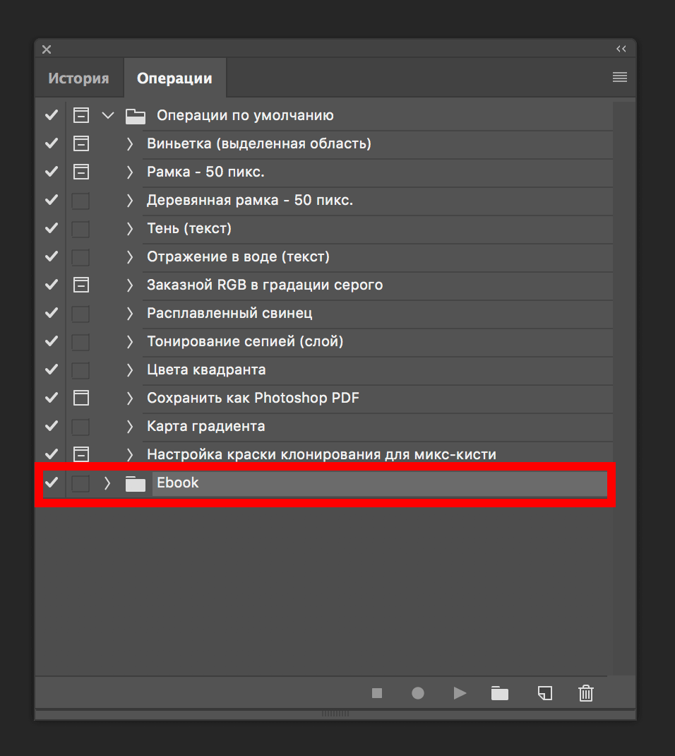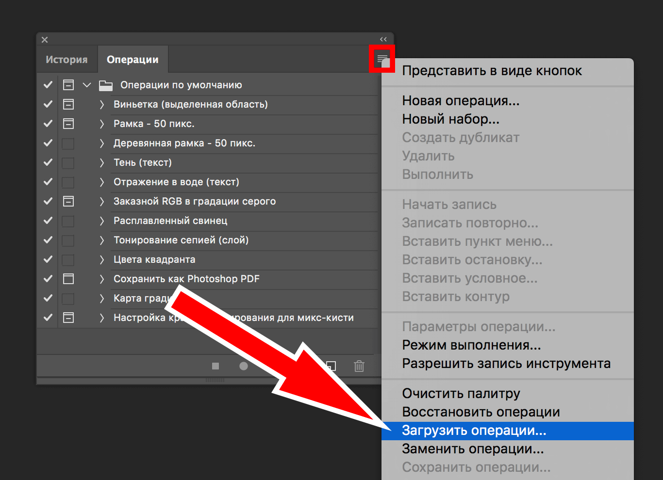 Откроется палитра, в которой нужно кликнуть на значок, выделенный на картинке ниже. Из выпавших строк выберем «Загрузить операции (Load Actions)».