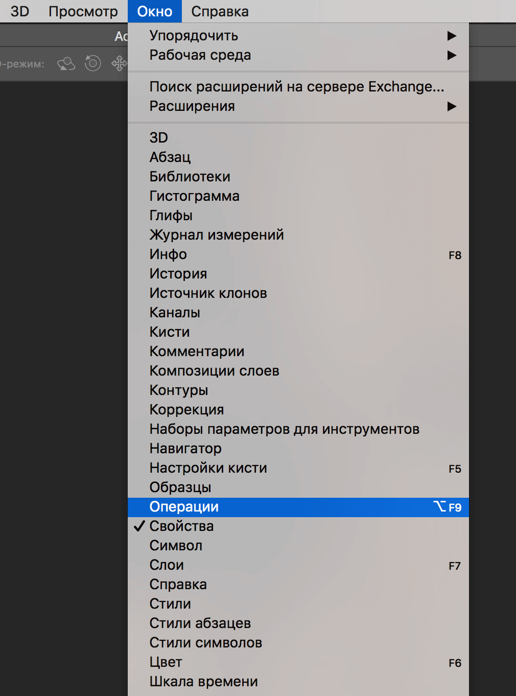 Переходим в меню “Окно (Window)” и выбираем “Операции (Actions)”.