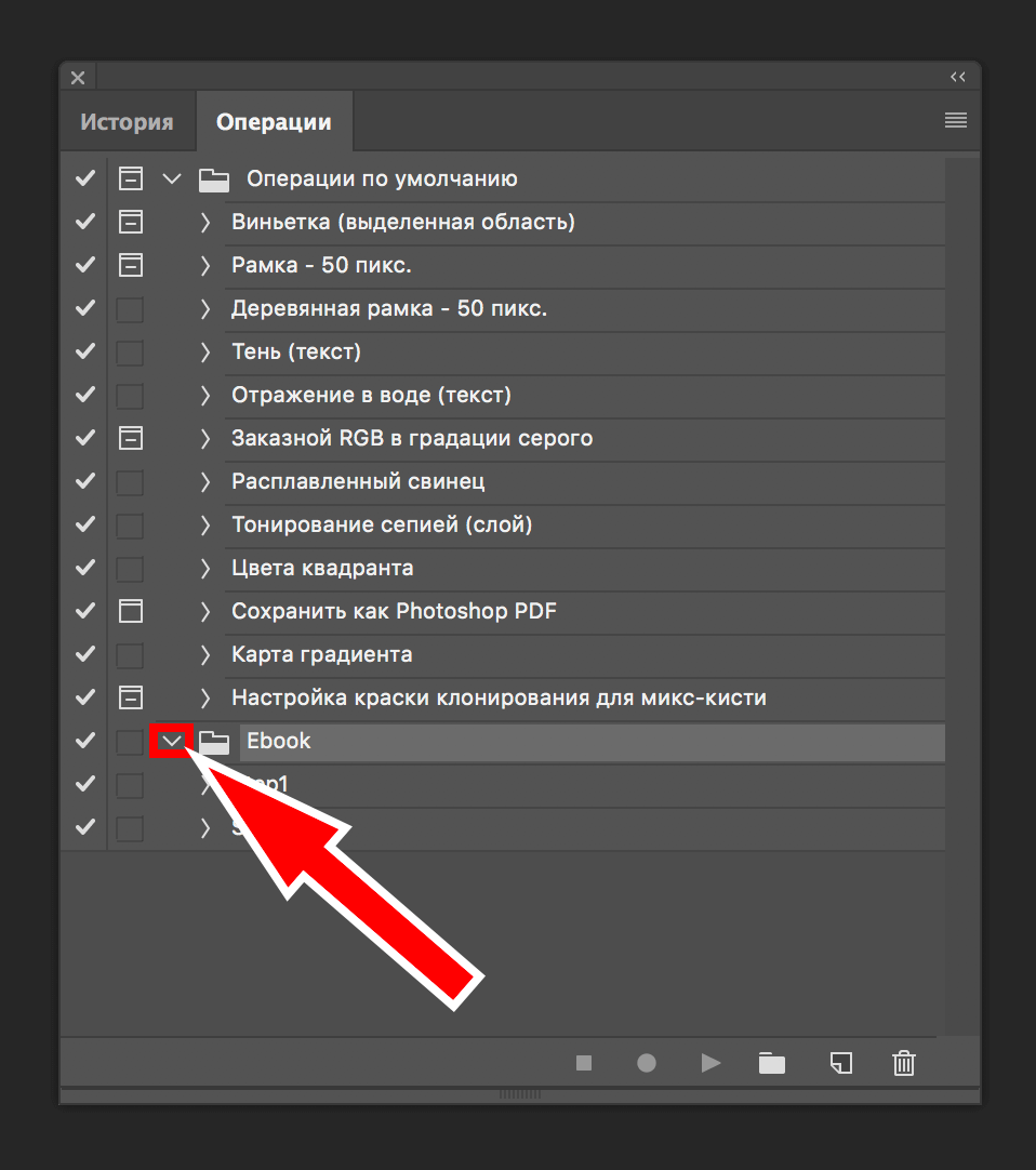 Затем нажимаем на значок треугольника возле знака папки с названием. Таким образом мы раскроем операции нашего экшна.