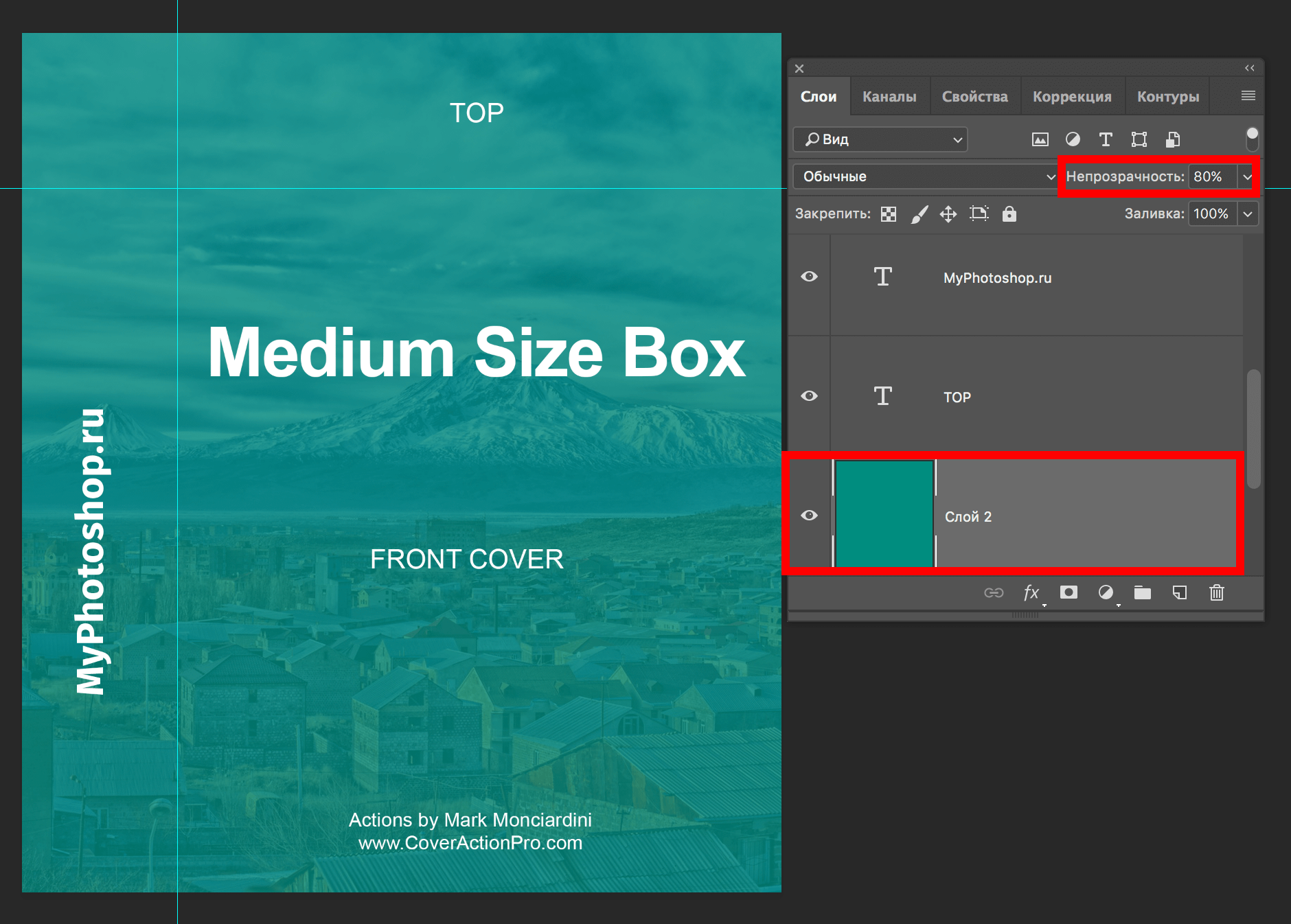 Руководствуясь направляющими обрезаем лишнее, если это требуется. Мы же в своем примере оставим все, как есть. Единственное, что нам понадобится – создать новый слой поверх фона, залить его нашим фирменным цветом и поставить непрозрачность на 80%, чтобы текст на обложке легко читался. Кстати, после того, как обработали фон, перемещаем текстовые слои поверх фона.