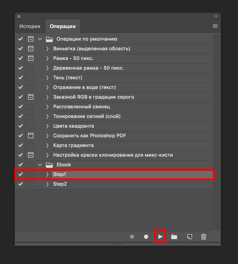 Из открывшихся операций нам нужно выбрать «Step 1». После запускаем экшен в работу кнопкой «Play».