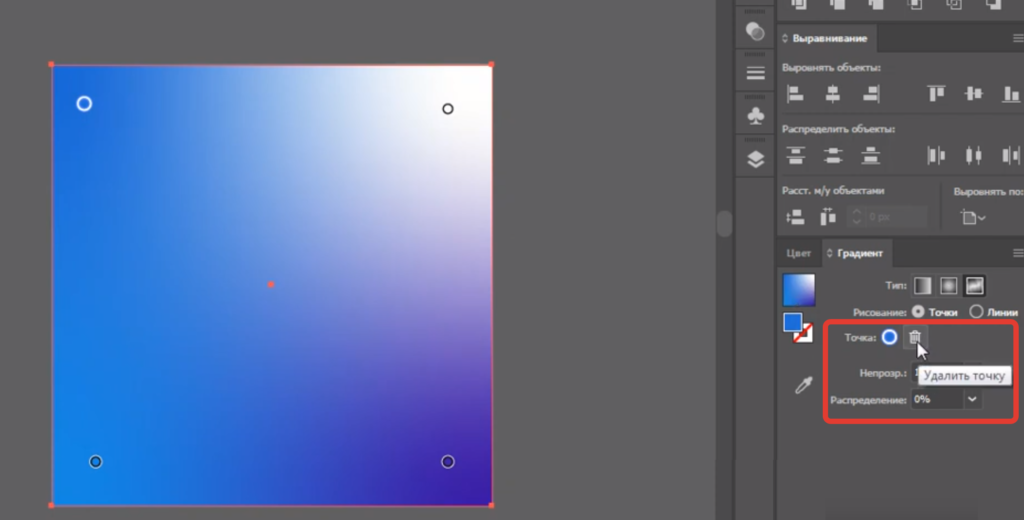 Чтобы удалить точку нужно ее выделить и нажать на кнопку Удалить в панели Градиент, либо мышкой перетащить точку за пределы фигуры.