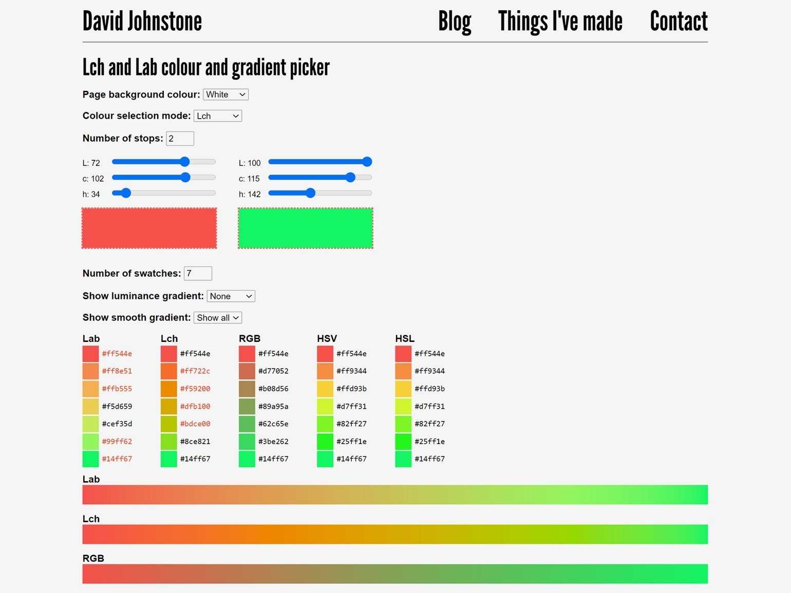В качестве альтернативного метода создания градиента в LAB можно воспользоваться инструментом Lch and Lab colour and gradient picker Дэвида Джонстона.