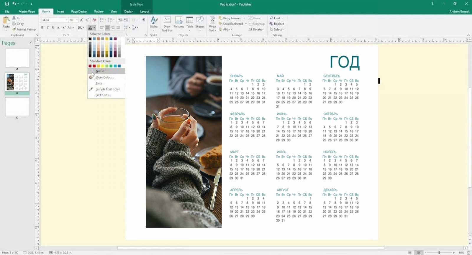 Выбор шаблонов для календарей в приложении меньше, чем в аналогах. А если вы захотите сделать в Publisher перекидной календарь – каждый месяц понадобится создавать по отдельности. Так что приложение будет удобно только для создания простого календаря на год.