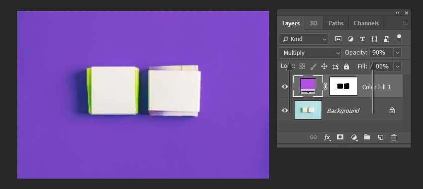 Переключаем режим наложения слоя-заливки на Multiply (Умножение) и корректируем непрозрачность слоя, чтобы настроить насыщенность цвета.