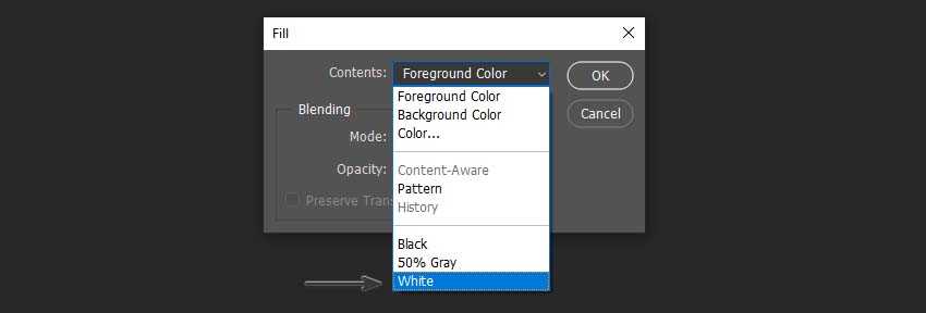 Если вы хотите, наоборот, залить уже созданный документ белым цветом, тогда просто переходим в меню Edit — Fill (Редактирование — Выполнить заливку) (или жмем Shift+F5) и в открывшемся окне в выпадающем меню выбираем цвет White (Белый).