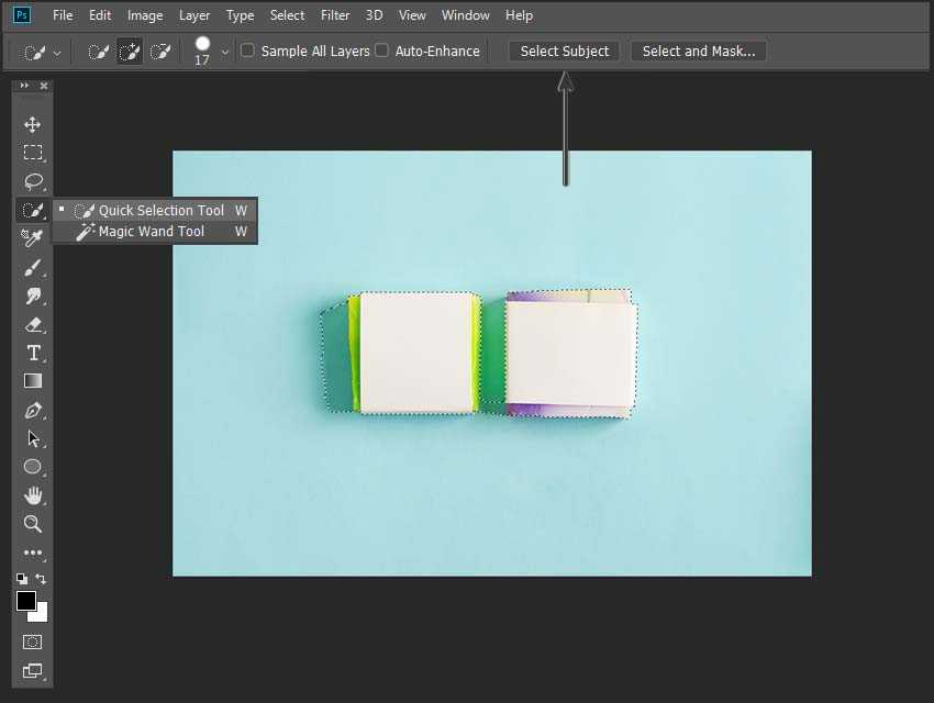 Для начала нам нужно выделить объекты на фото. Мы воспользуемся инструментом Quick Selection Tool (W) (Быстрое выделение), который можно найти на панели слоев. Проводим по объекту, чтобы выделить его. В последних версиях Фотошоп появился инструмент Object Selection Tool (W) (Выделение объекта), с помощью которого можно быстрее выделить нужный объект.