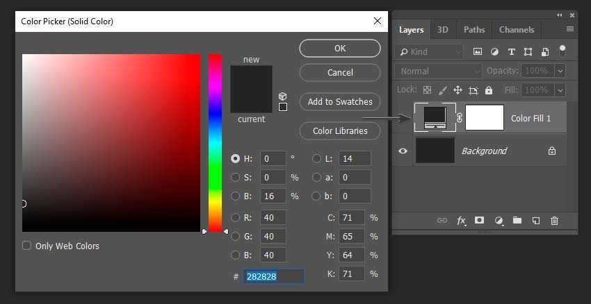 Также для замены цвета фона можно использовать слой-заливку. Переходим Layer — New Fill Layer — Solid Color (Слой — Новый слой-заливка — Цвет). Нажав на кнопку ОК, откроется окно выбора цвета, в котором мы выбираем нужный оттенок.