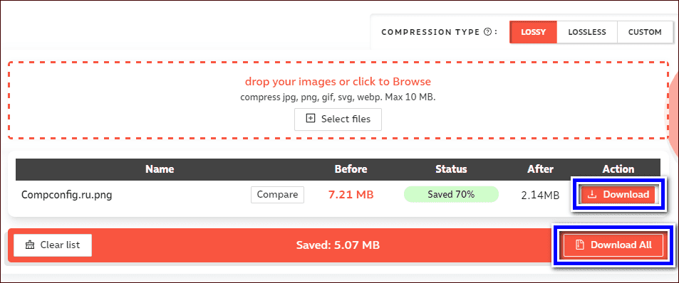 Нажмите кнопку «Скачать» или «Скачать все», если вы одновременно загружали несколько снимков для одновременного сжатия. Во втором случае вы получите один архив, который останется только распаковать и приступить к взаимодействию с уже оптимизированными JPEG-изображениями.