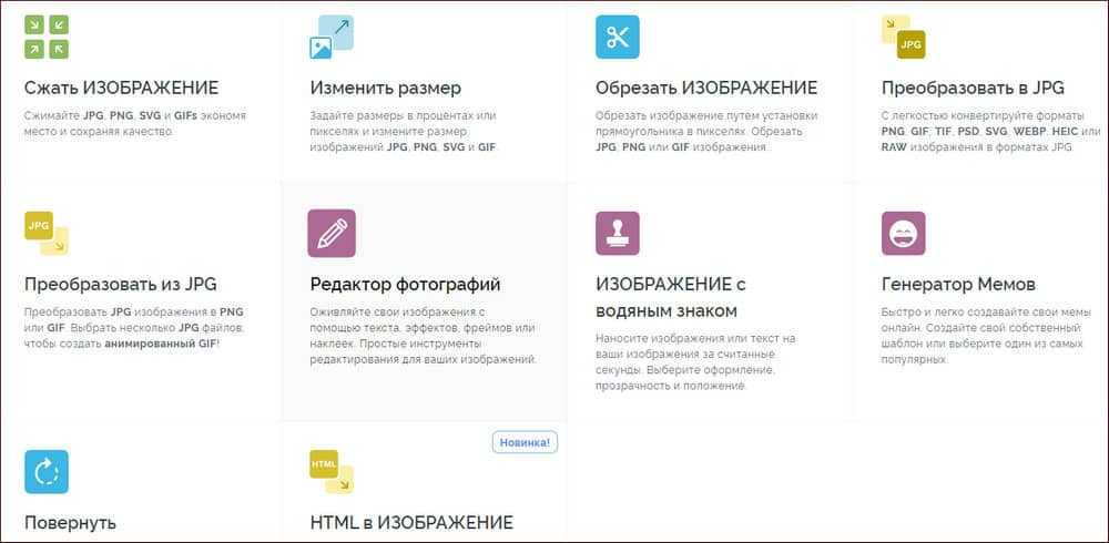 Сервис iloveimg.com – это полноценный онлайн инструмент для обработки изображений в разных форматах, в том числе jpeg. В его функционал входят такие функции как: