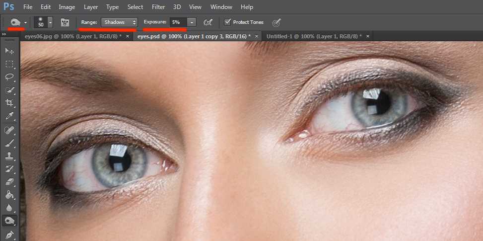 Чтобы повысить контраст на радужке и сделать глаз более «живым», мы будем использовать инструменты Dodge и Burn. Оба они хороши тем, что имеют параметр Range, позволяющий применять их только к светлым, тёмным или средним тонам на фотографии.
