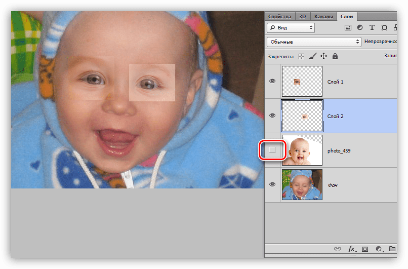 Сейчас очень четко видно границы слоя с глазами. Давайте их растушуем.
