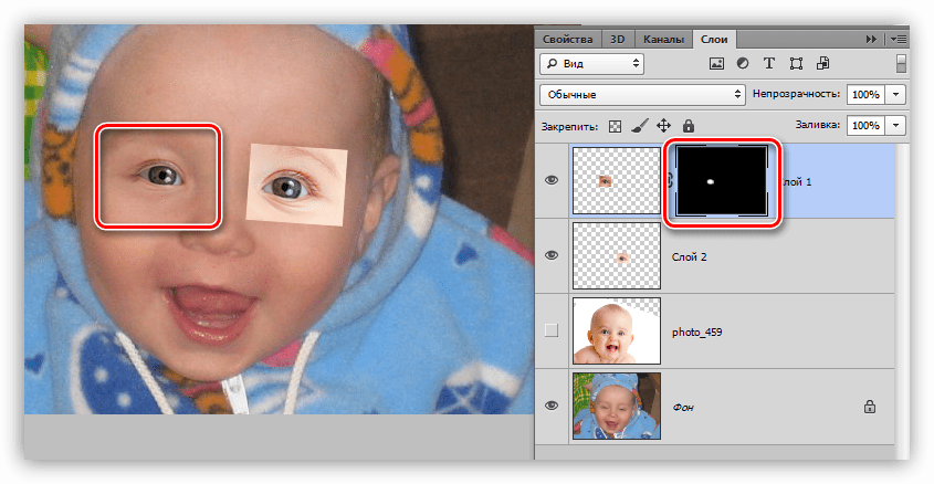 Идея простая: нам нужно заменить глаза ребенка на первом изображении на соответствующие участки второго.