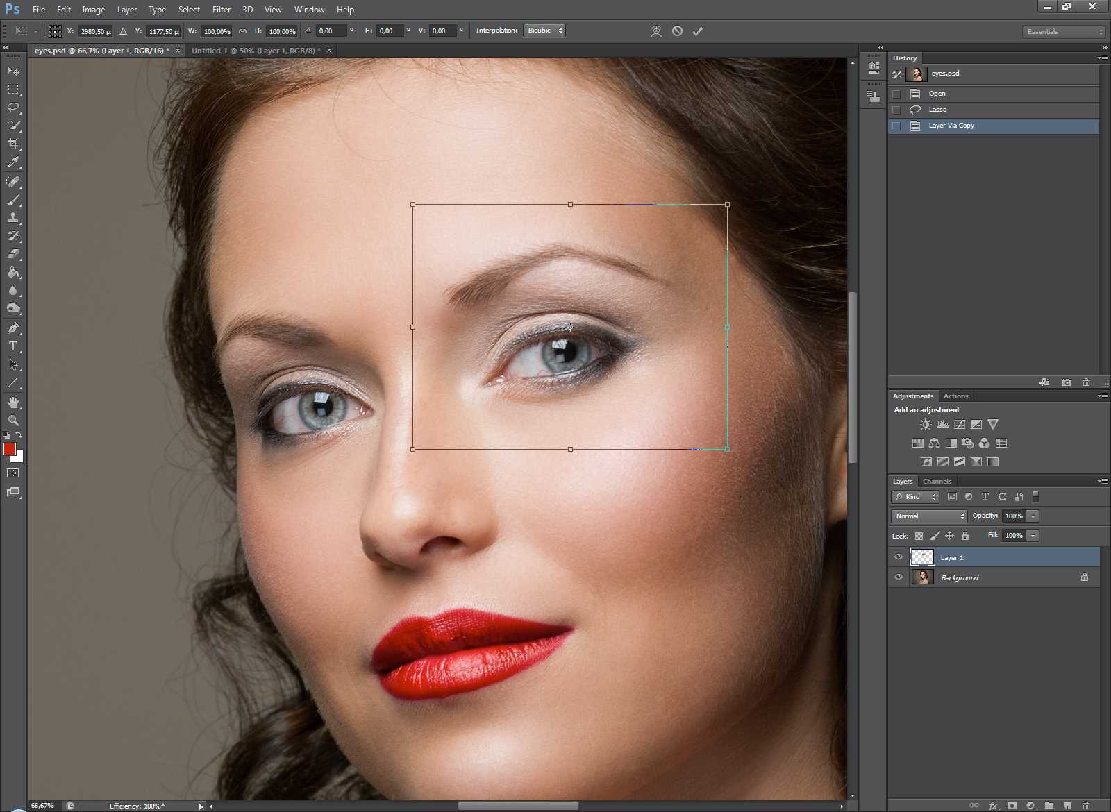 Изменить размер глаз модели можно с помощью инструмента Free Transform. Естественно, следует помнить, что такое вмешательство существенно изменит внешность, а это может понравиться не всем. Однако, если вам нравятся большие глаза, приступим.