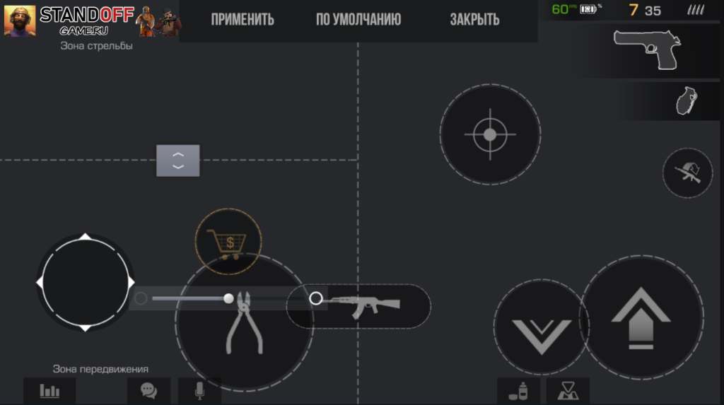 Кнопка «Прыжок» располагается в нижнем правом углу экрана. Чуть выше нее будет кнопка «Бросить оружие». В верхнем правом углу размещаем иконку Пистолета, а ниже – бросить гранату. Прицел располагается в правой верхней части экрана прямо под кнопкой приседа. Кнопку «Диффузия» нужно переместить снизу слева от центральной вертикали. Ее можно делать большой и прозрачной, потому что во время игры она становится заметной при приближении к бомбе. Прямо по центру в нижней части экрана необходимо расположить пиктограмму «Выбрать автомат».