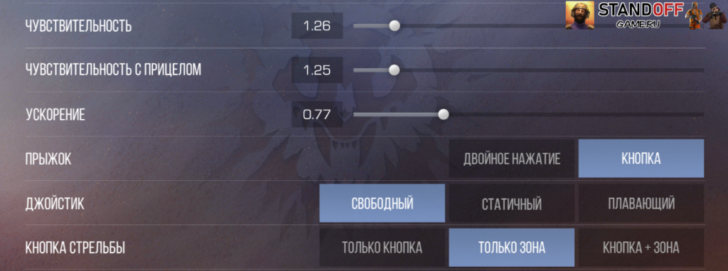 Устанавливаем чувствительность на уровне 1,26, а чувствительность с прицелом – на уровне 1,25. После этого двигаем ползунок ускорения к отметке 0,77. В пилу битвы времени на лишние движения нет, поэтому для прыжка используем кнопку. Джойстик нужен простой свободный. Для стрельбы выбираем только зону (целый участок экрана).