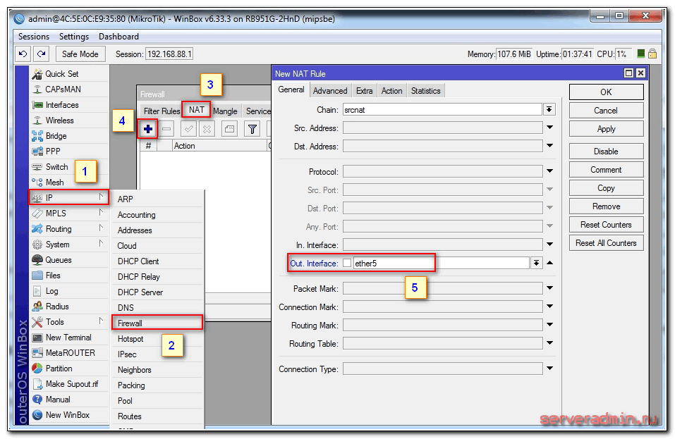 Идем в раздел IP -> Firewall, открываем вкладку NAT и жмем плюсик. На вкладке General указываем только один параметр Out. Interface — ether5 (интерфейс подключения к провайдеру), все остальное не трогаем.