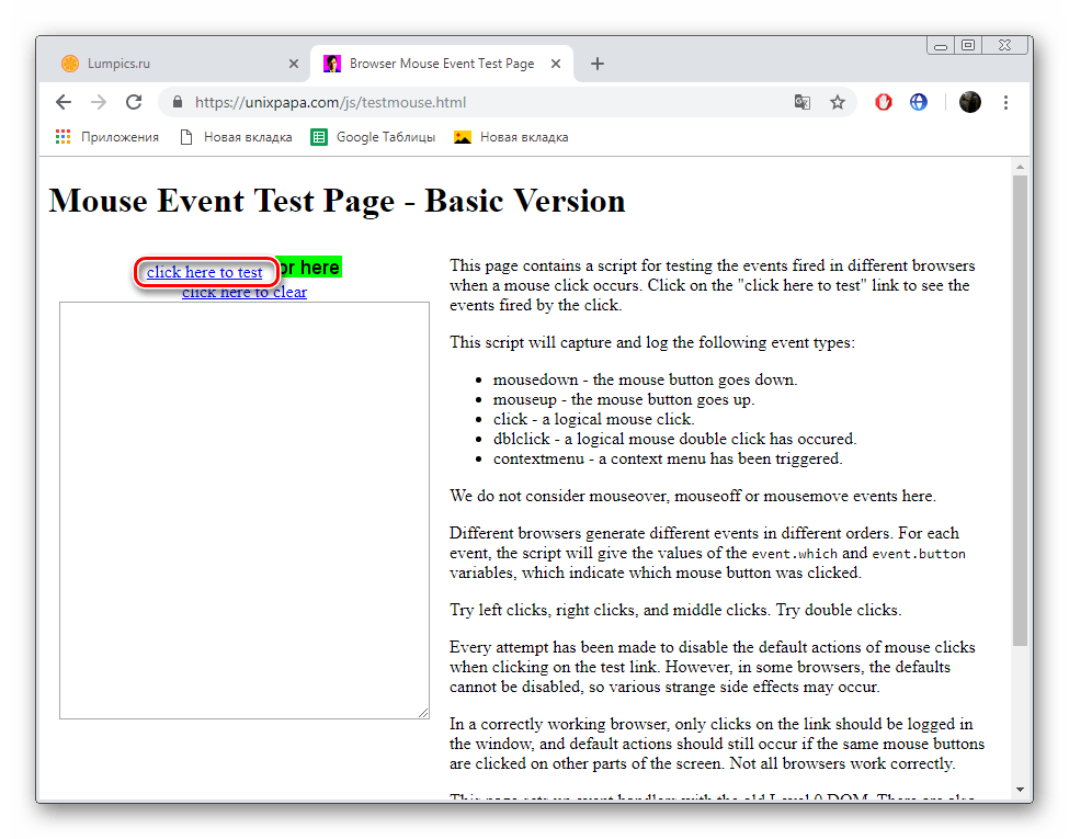 На сайте UnixPapa вам доступно проведение анализа другого рода, который отвечает за нажатие на кнопки мыши. Он позволит узнать, нет ли залипаний, двойных кликов или случайных срабатываний. Осуществляется тестирование на данном веб-ресурсе следующим образом: