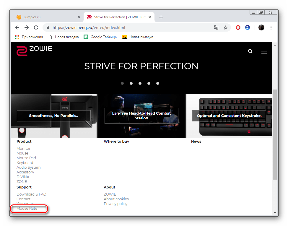 - Перейдите на главную страницу сайта Zowie и опуститесь вниз вкладки, чтобы найти раздел «Mouse Rate».