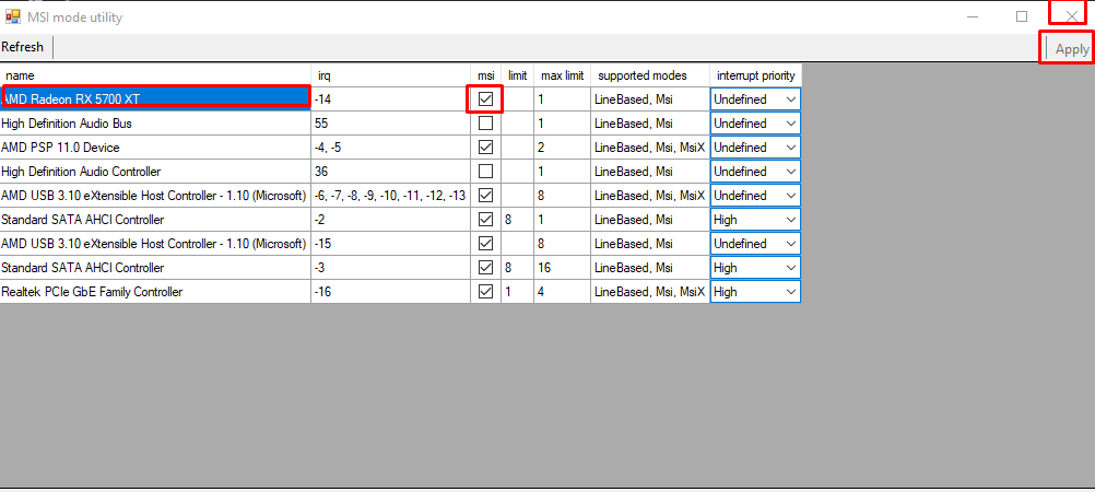 Look for your graphics card, and once you find it ticks the MSI box, click Apply and Exit. That’s all you have to do, don’t edit any of the priorities if you don’t know what you are doing.