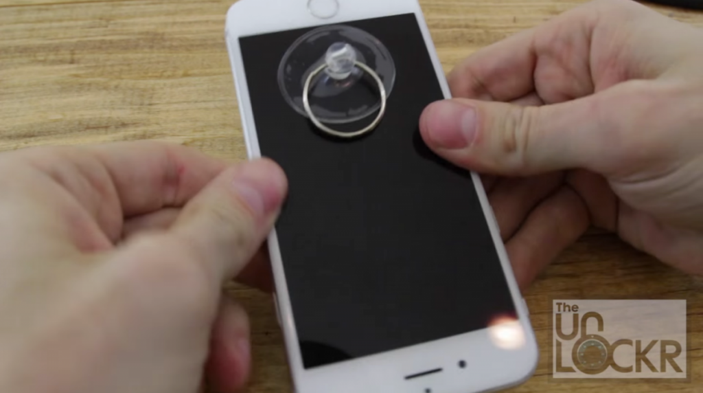 1. Сначала необходимо открутить болты у порта Lightning, прилепить присоску к экрану и медленно отделить его от корпуса, отсоединив шлейфы, которыми он подключен к логической плате.