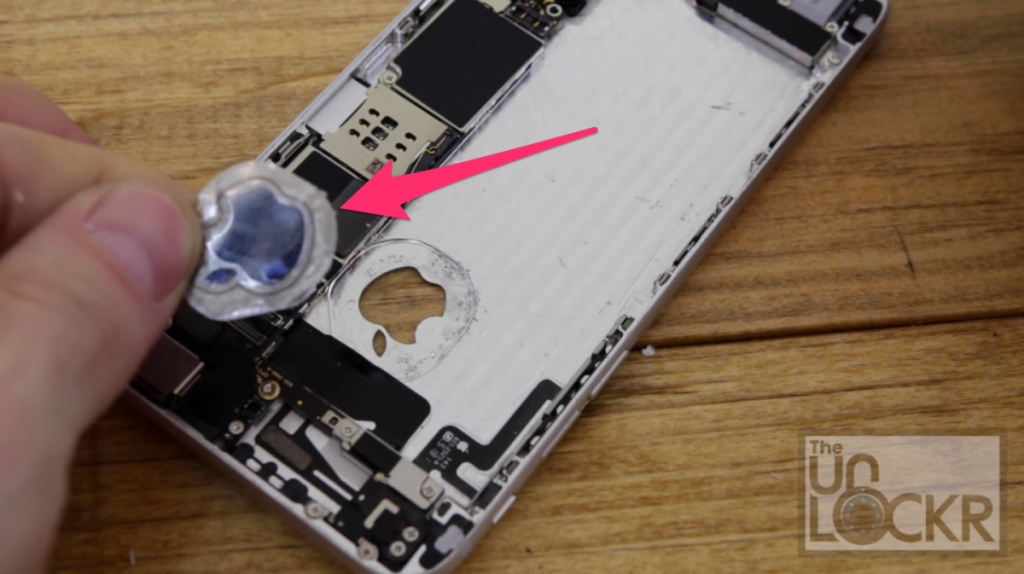 3. За батареей прячется приклеенная на черный скотч блестящая фольга — это оригинальный логотип Apple. Оторвать ее без повреждений не получится.